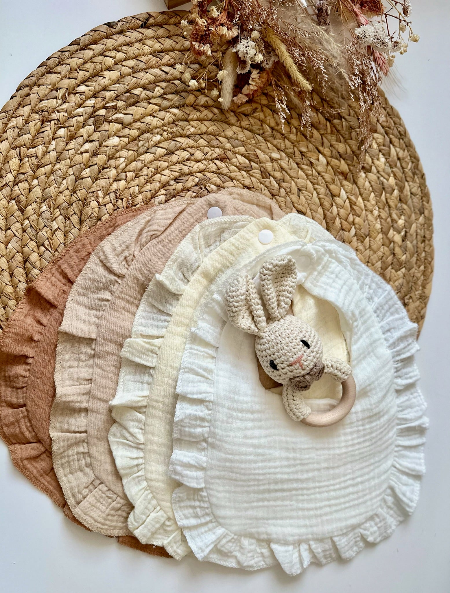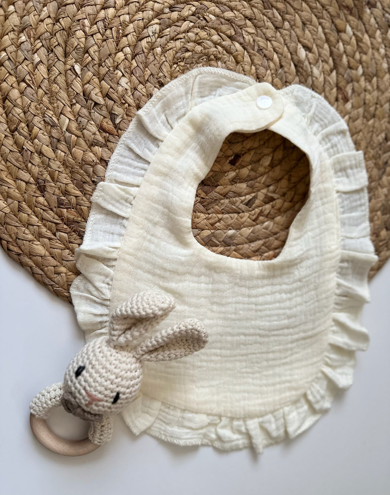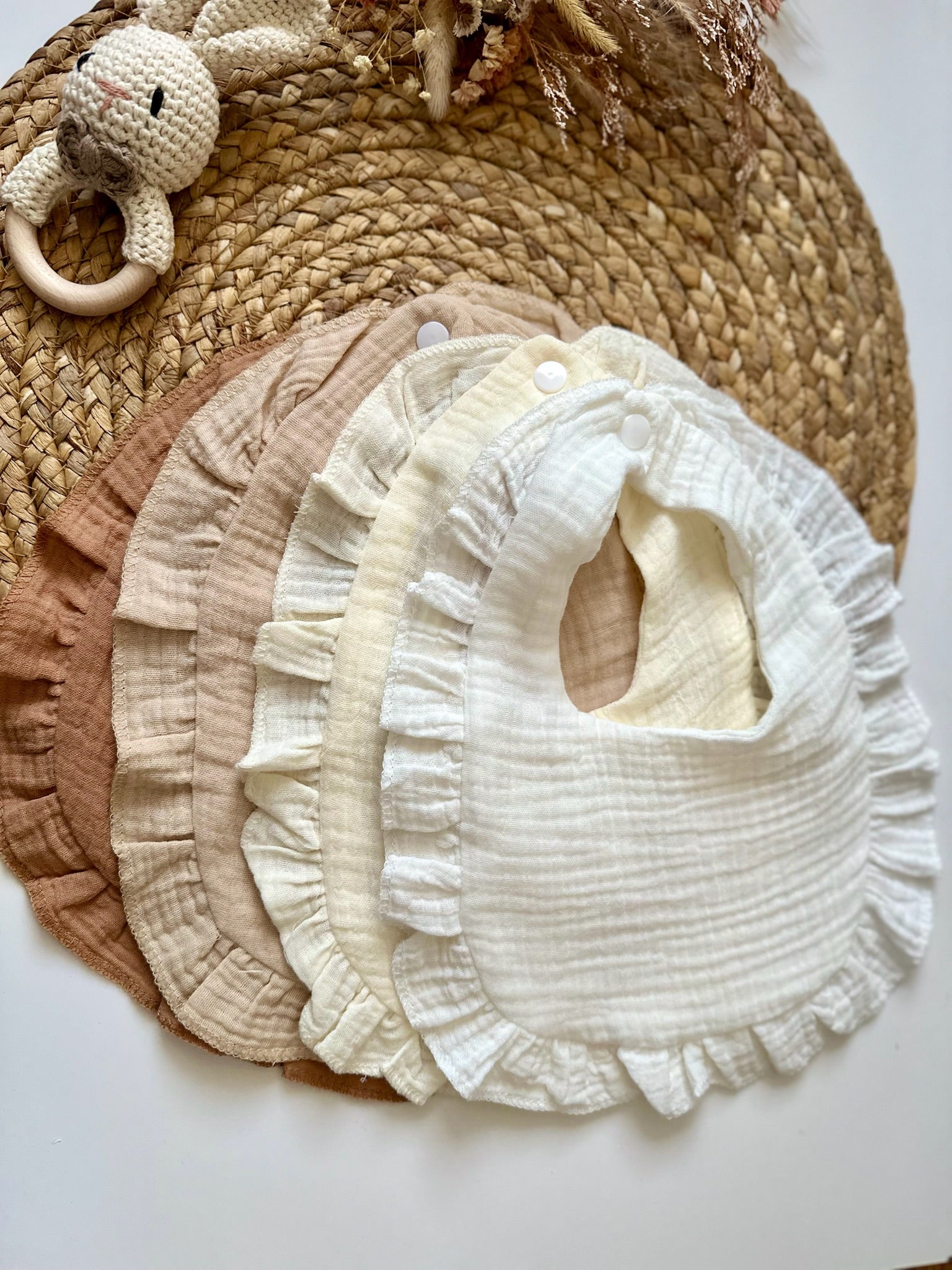 Este delicado babero de muselina es la mezcla perfecta entre funcionalidad y estilo minimalista. Confeccionado en algodón suave, presenta un diseño circular con pequeños volantes en todo el borde, ideal para acompañar cualquier look con un toque dulce y elegante.