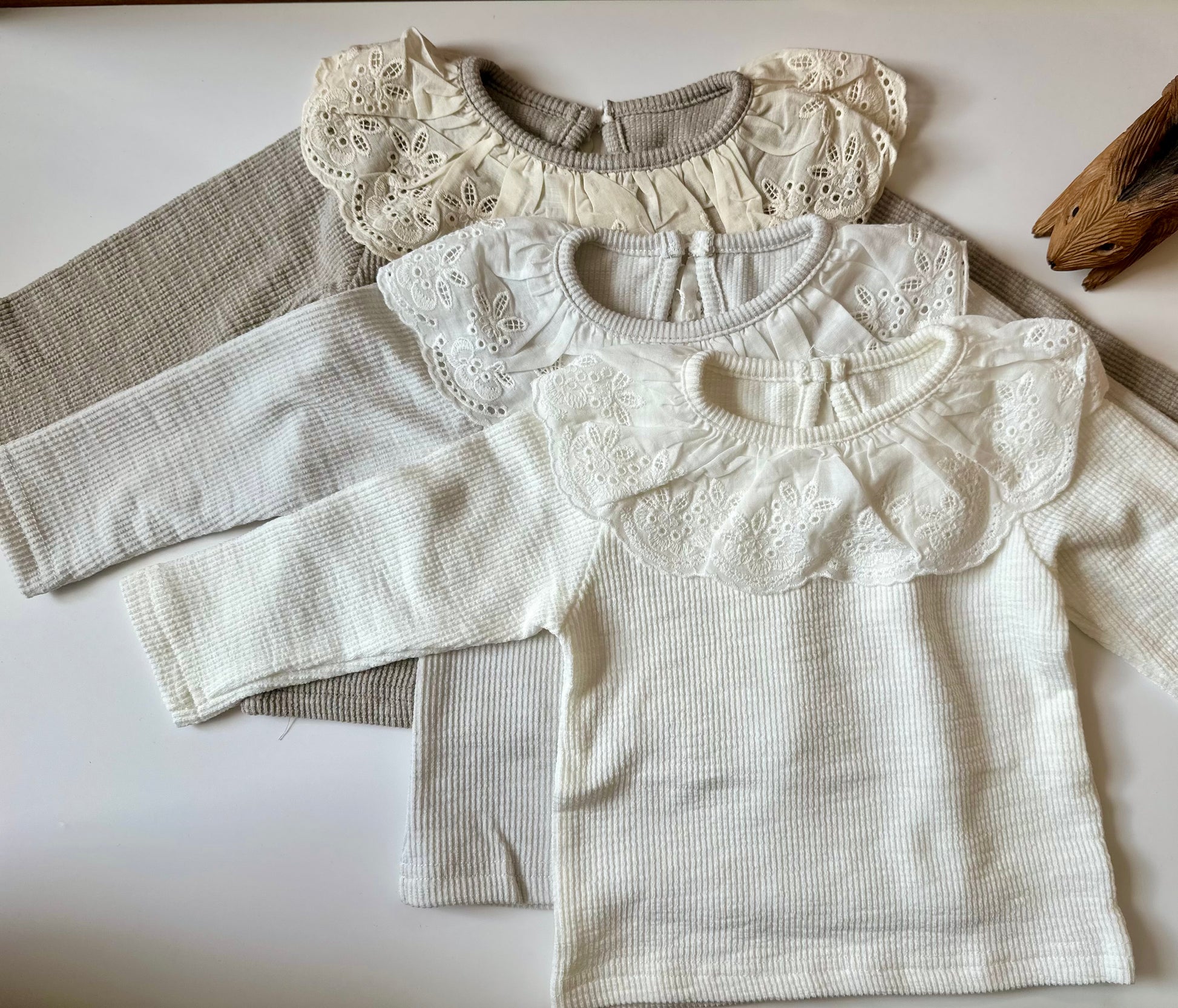 Polera de manga larga, con delicado cuello de encaje bordado estilo romántico. Vienen en tonos neutros y elegantes: beige, gris claro y blanco, perfectos para un look clásico y sofisticado en los primeros meses. El detalle del cuello de encaje aporta un aire tierno y refinado, ideal tanto para ocasiones especiales como para un estilo diario con un toque distinguido.