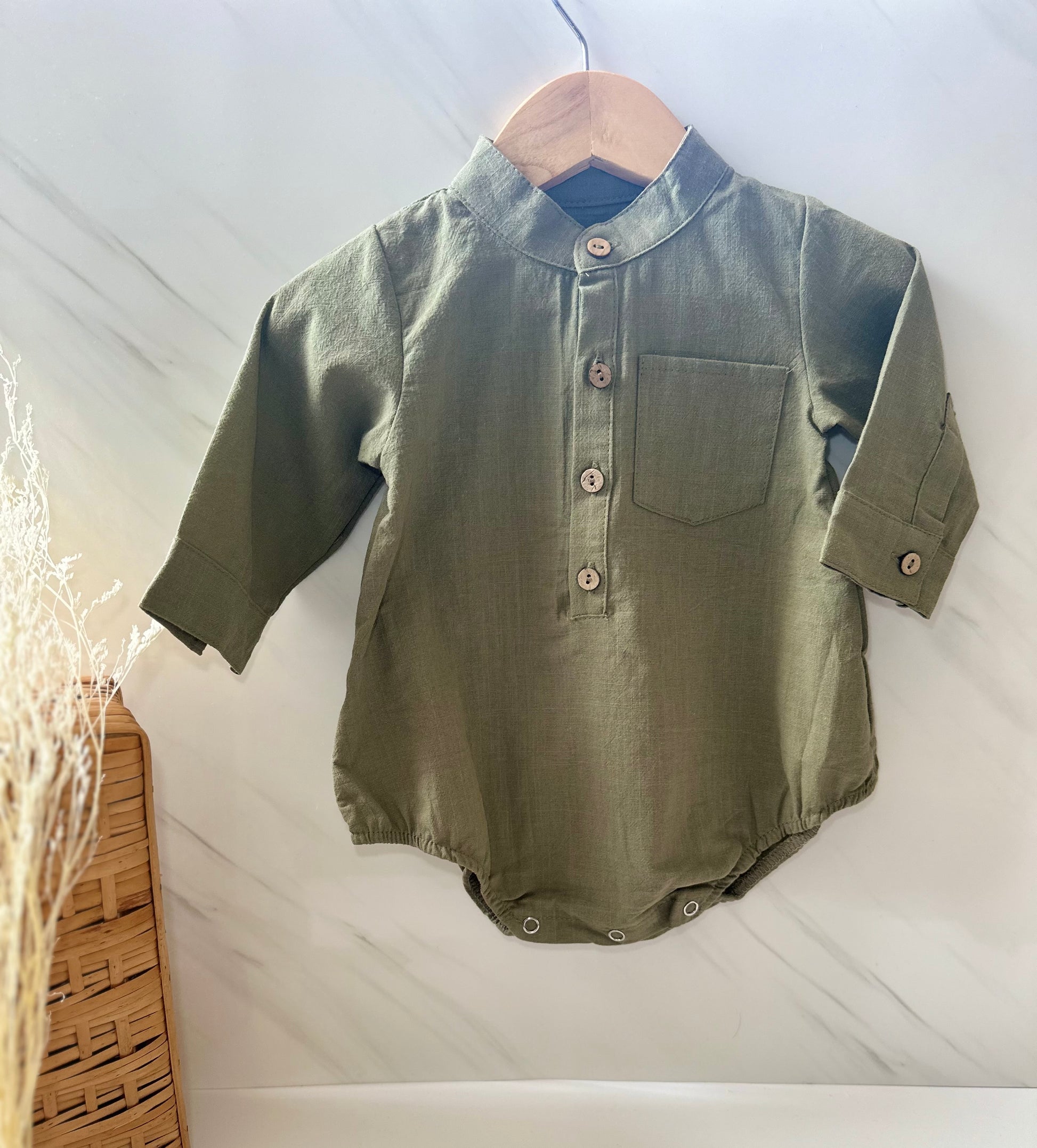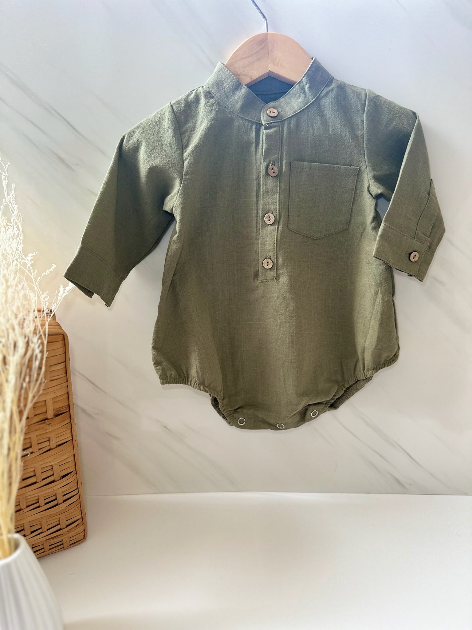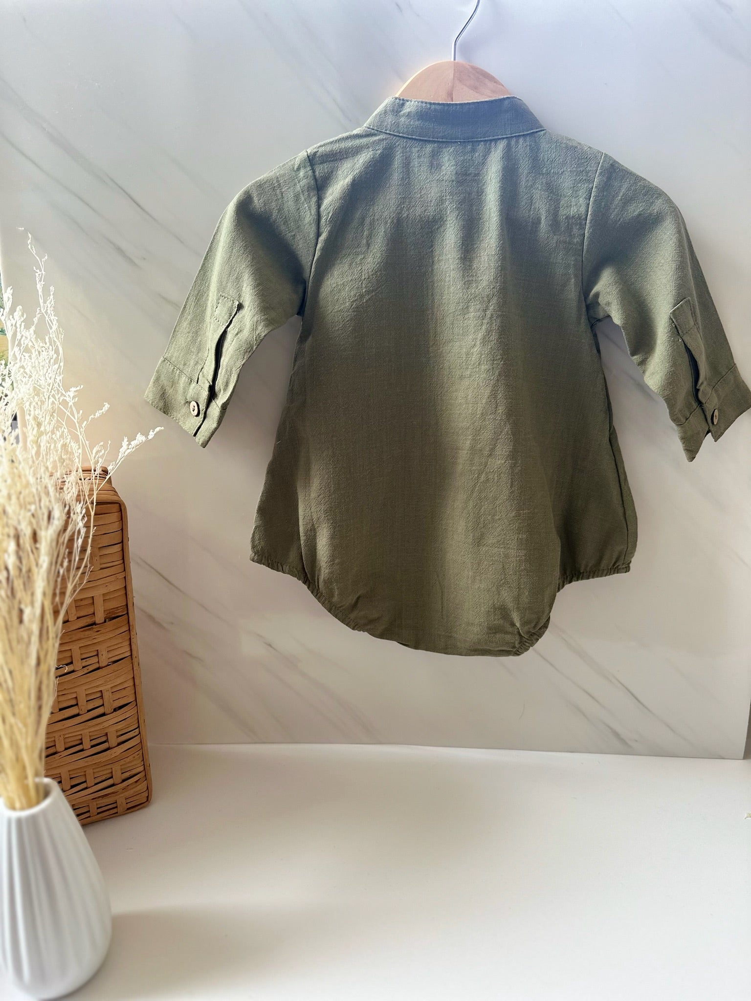 Este body tipo camisa es una prenda versátil y sofisticada para el clóset de tu bebé. Confeccionado en una mezcla de lino de apariencia natural, su diseño incluye cuello mao, botones delanteros y en los puños, un bolsillo en el pecho y broches inferiores para facilitar el cambio de pañal. Ideal para ocasiones especiales o para un look refinado en el día a día.