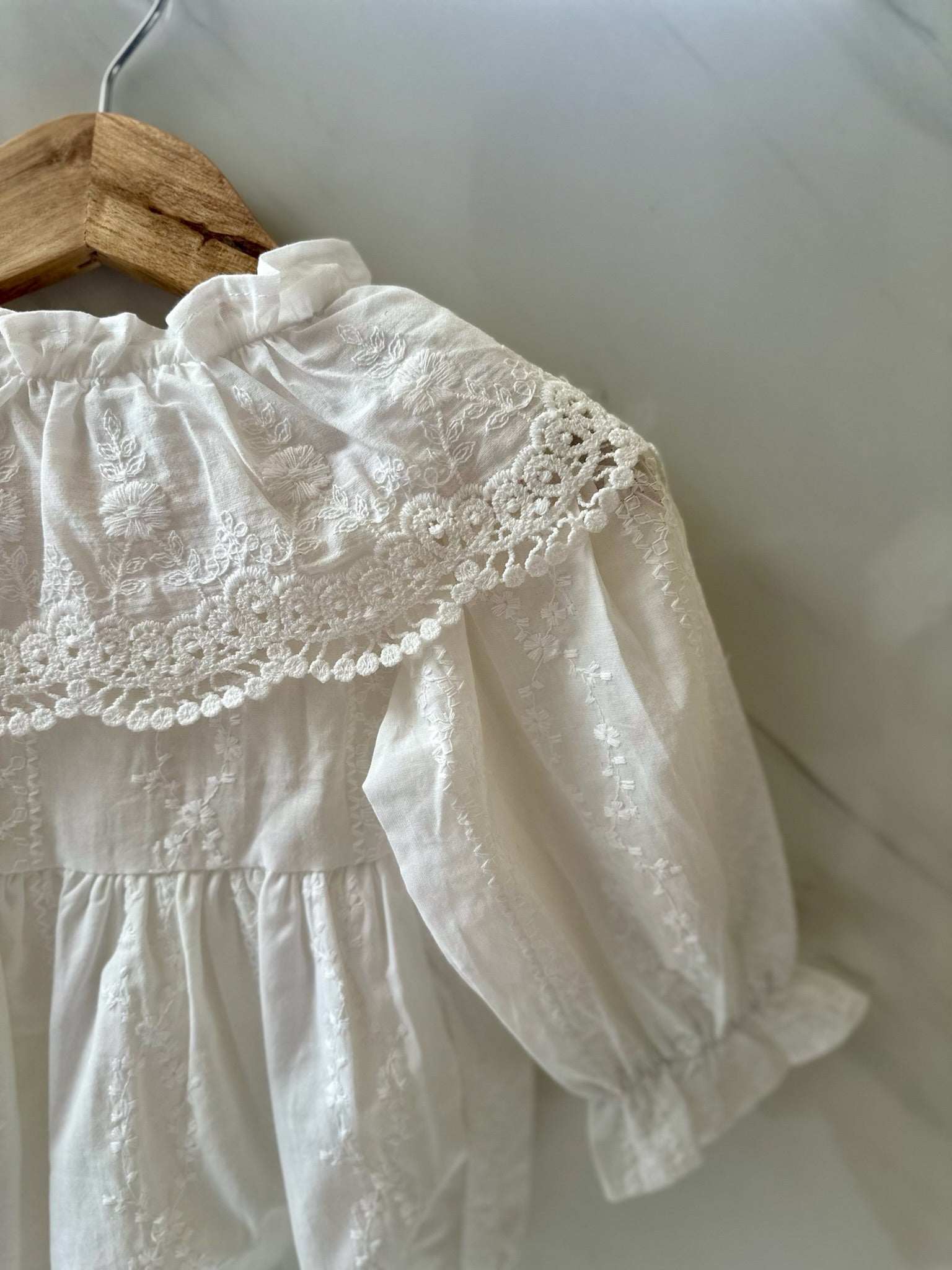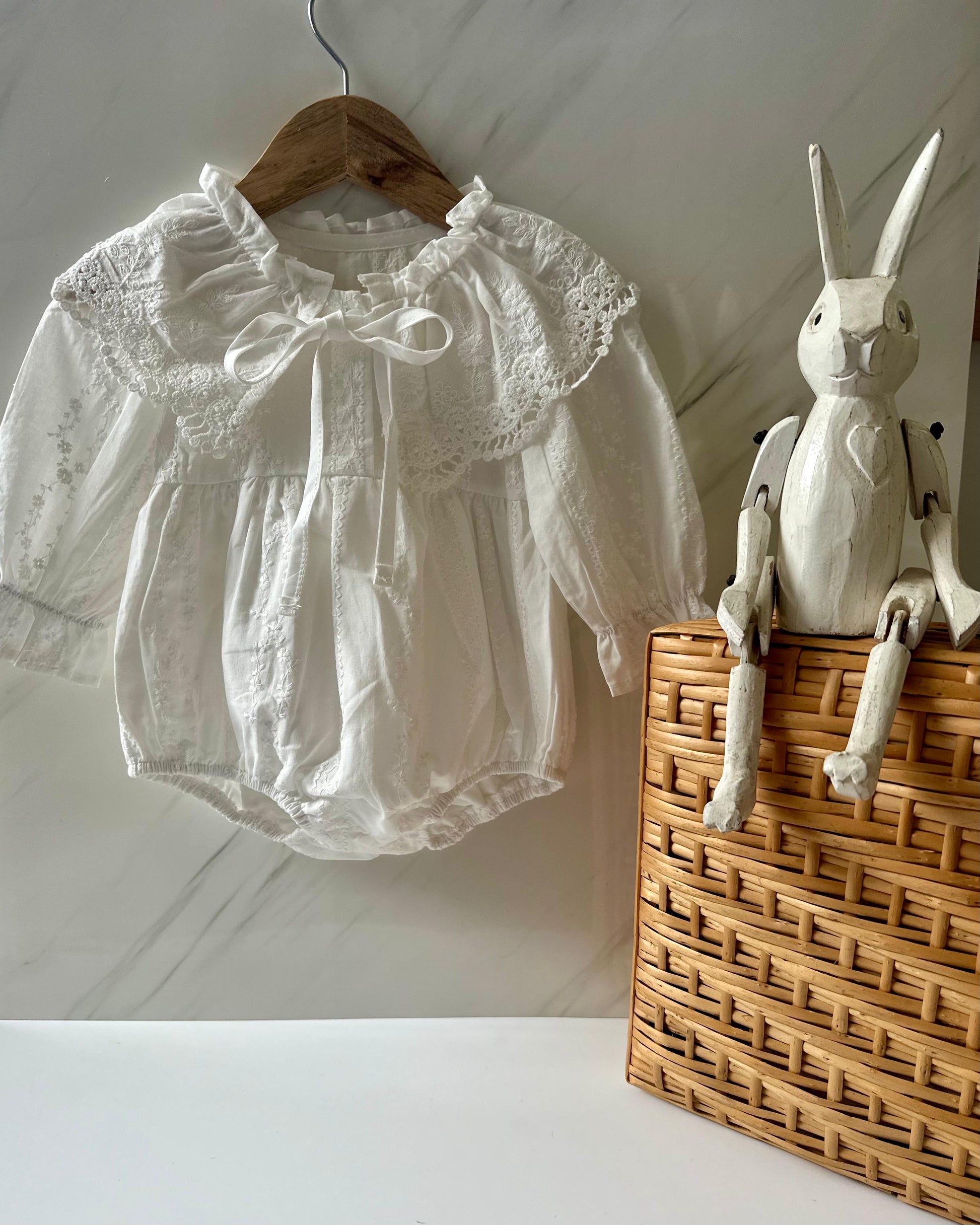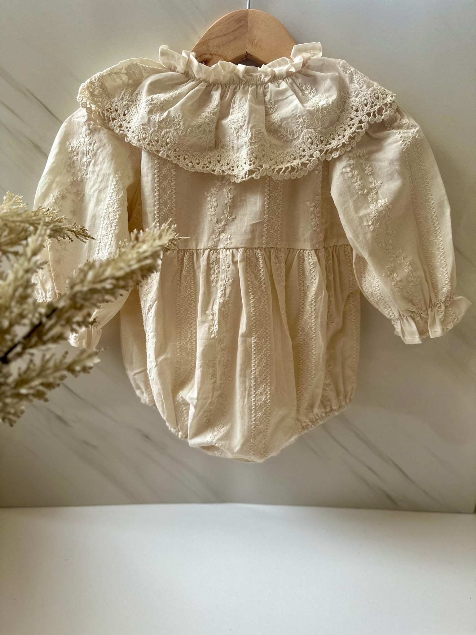 Esta encantadora ranita tipo vestido, estilo romántico es una prenda imprescindible para ocasiones especiales como bautizos o para lucir adorable en el día a día.