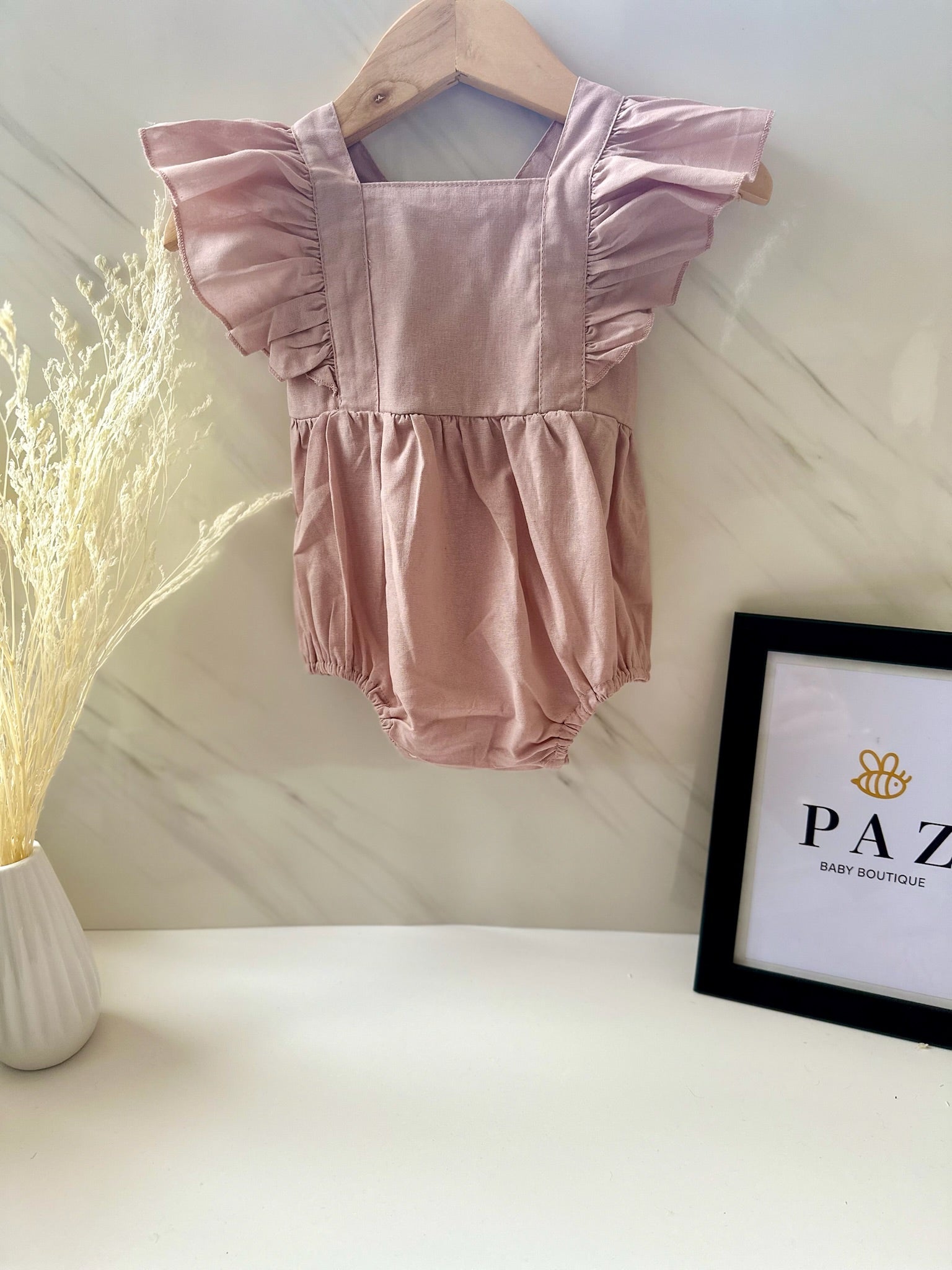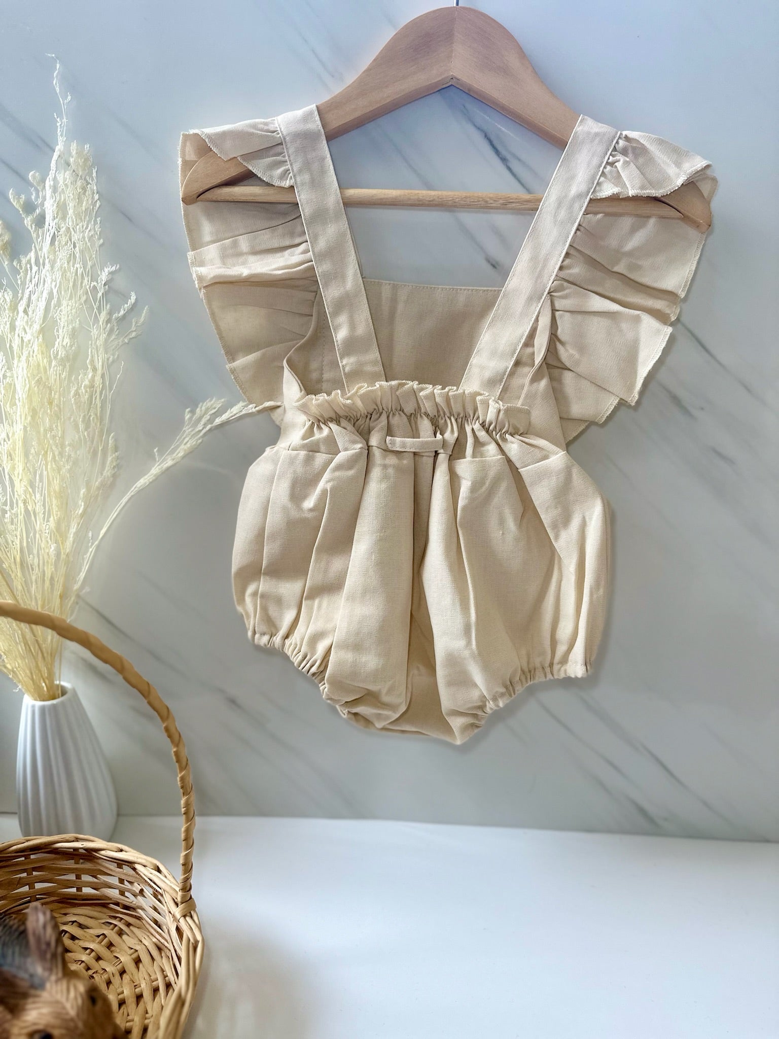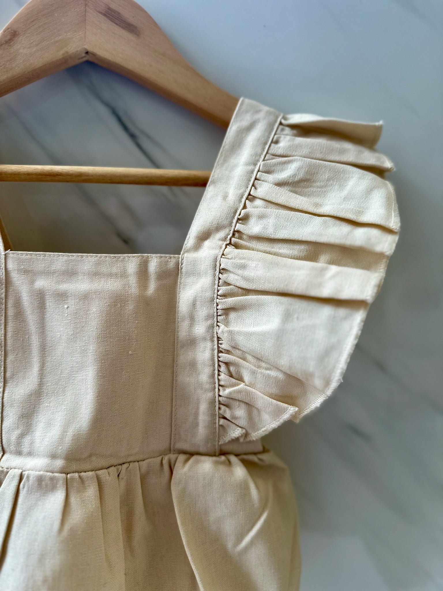 Su diseño sin mangas con tirantes en V y delicados volantes en los hombros le da un aire elegante y femenino. En la parte posterior, destaca un hermoso moño que añade un toque encantador y sofisticado.