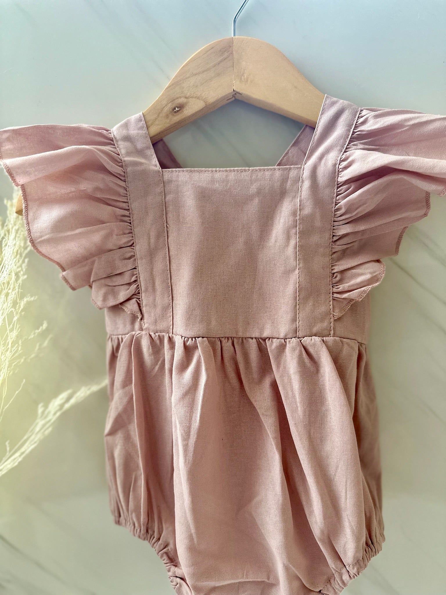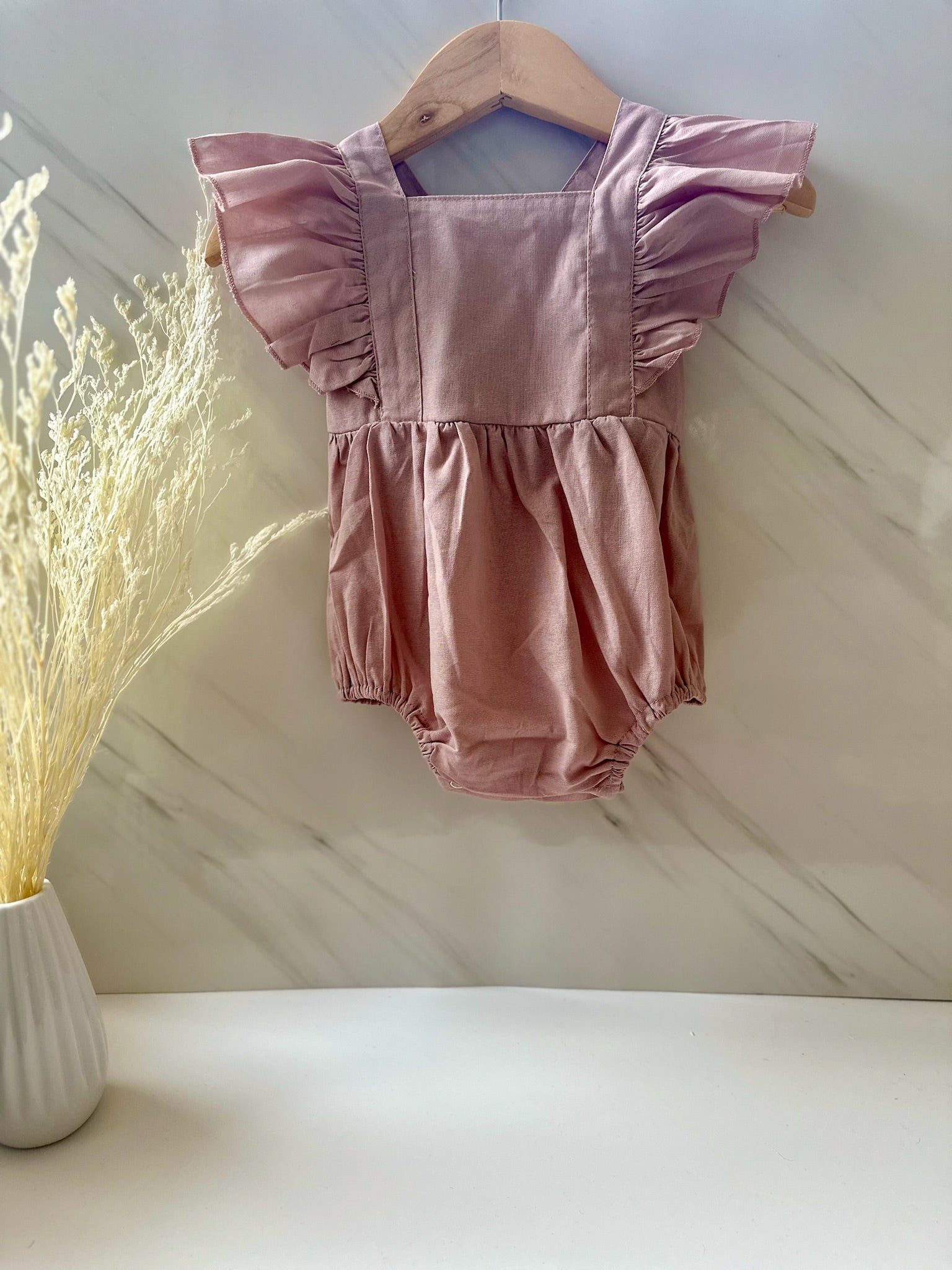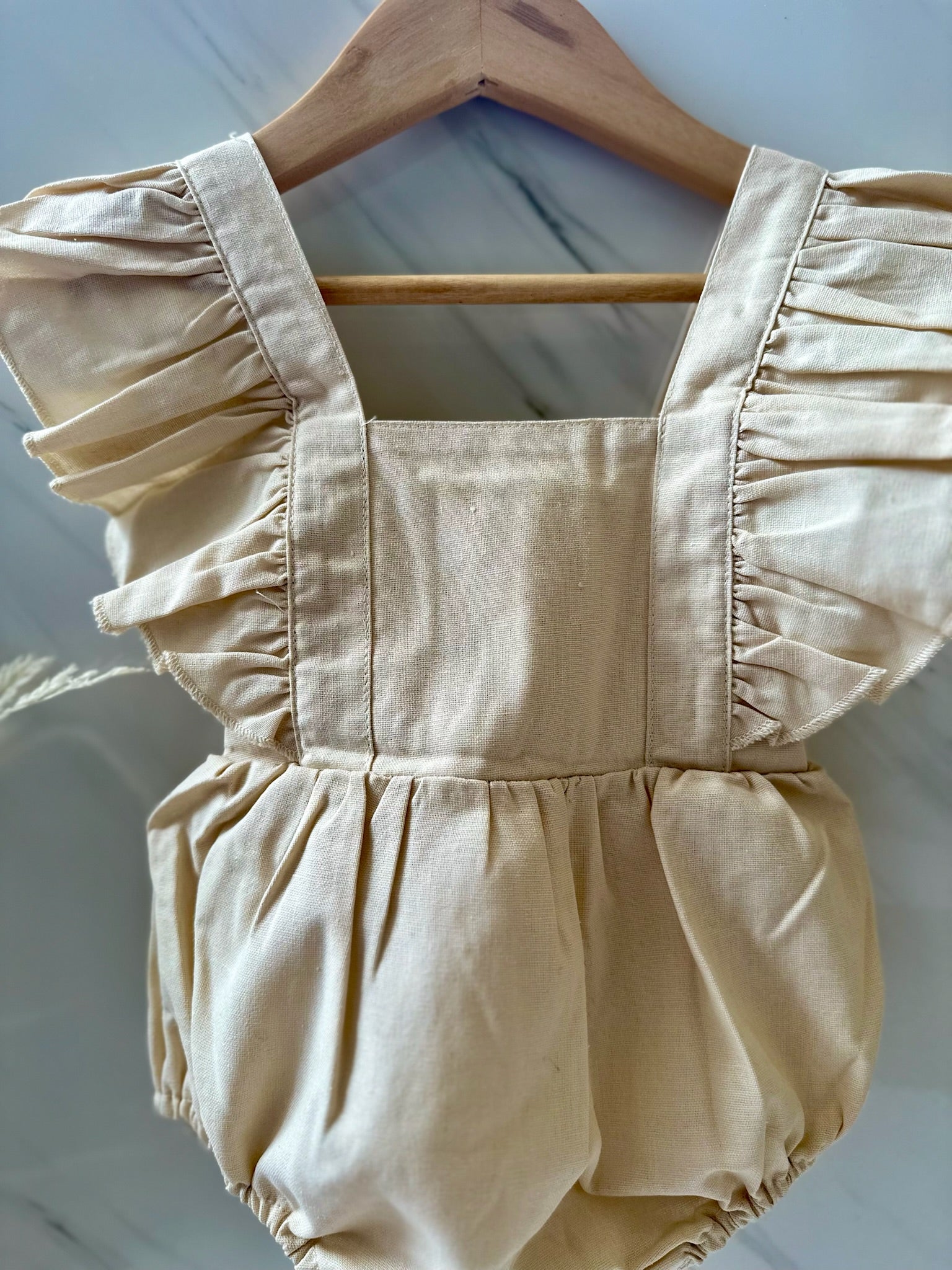 Su diseño sin mangas con tirantes en V y delicados volantes en los hombros le da un aire elegante y femenino. En la parte posterior, destaca un hermoso moño que añade un toque encantador y sofisticado.